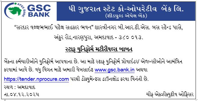 | 1 | GSCB/GENERAL/67/53 | E-TENDER FOR PROVIDING STAFF UNIFORM CLOTHES FOR THE GSC BANK | Download Document |